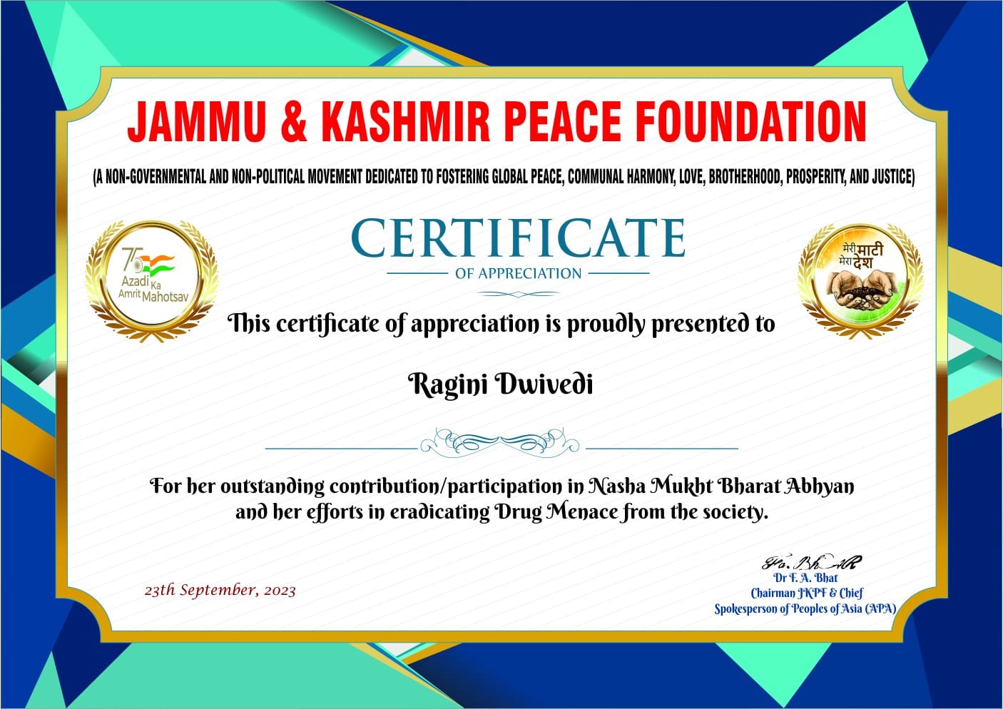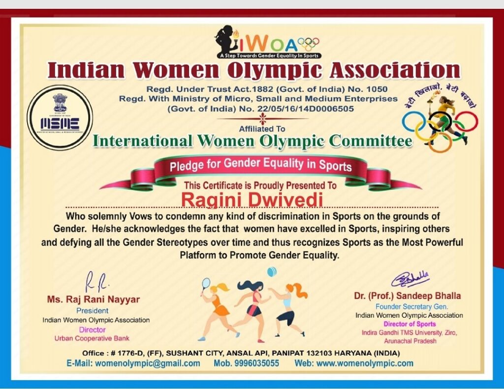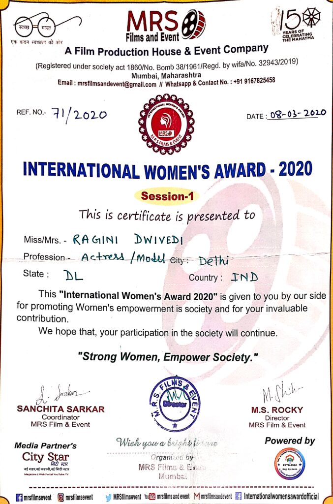 The felicitation took place at the Constitution Club of India in the presence of former Union Minister Dr. S Krishna Kumar and former Member of Parliament Dr. Advocate Shan Russel Criminal Psychology, Palo Alto University, USA, and Pro-Vice Chancellor Dr. R. Vijaya Saraswathy. Ragini was also invited as a VIP Guest at the Miss & Mrs. Teej Queen of India Global Style event held at Radisson Blu Plaza Mahipalpur. The event was graced by Mr. Sandeep Marwah, the Founder & President of the Asian Academy of Film & Television in Noida Film City and the founder of Marwah Studios.