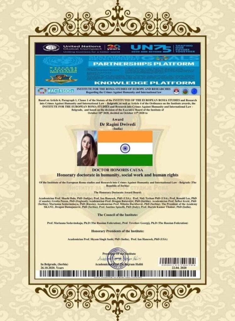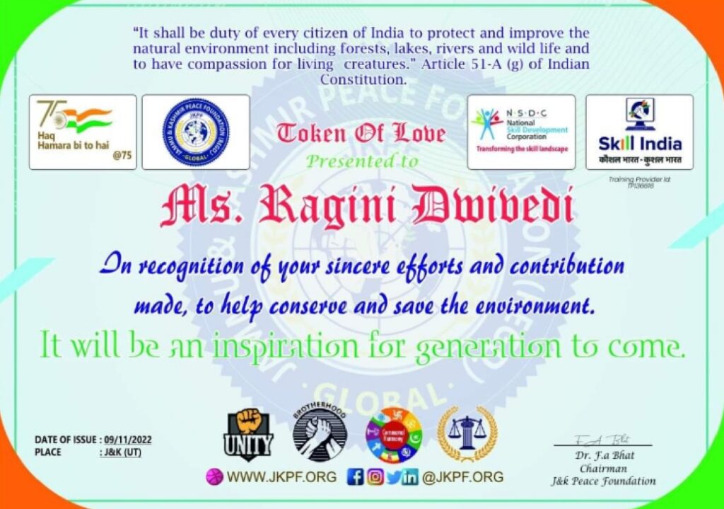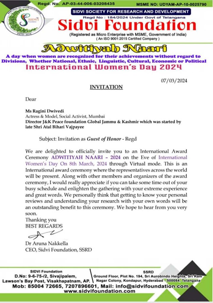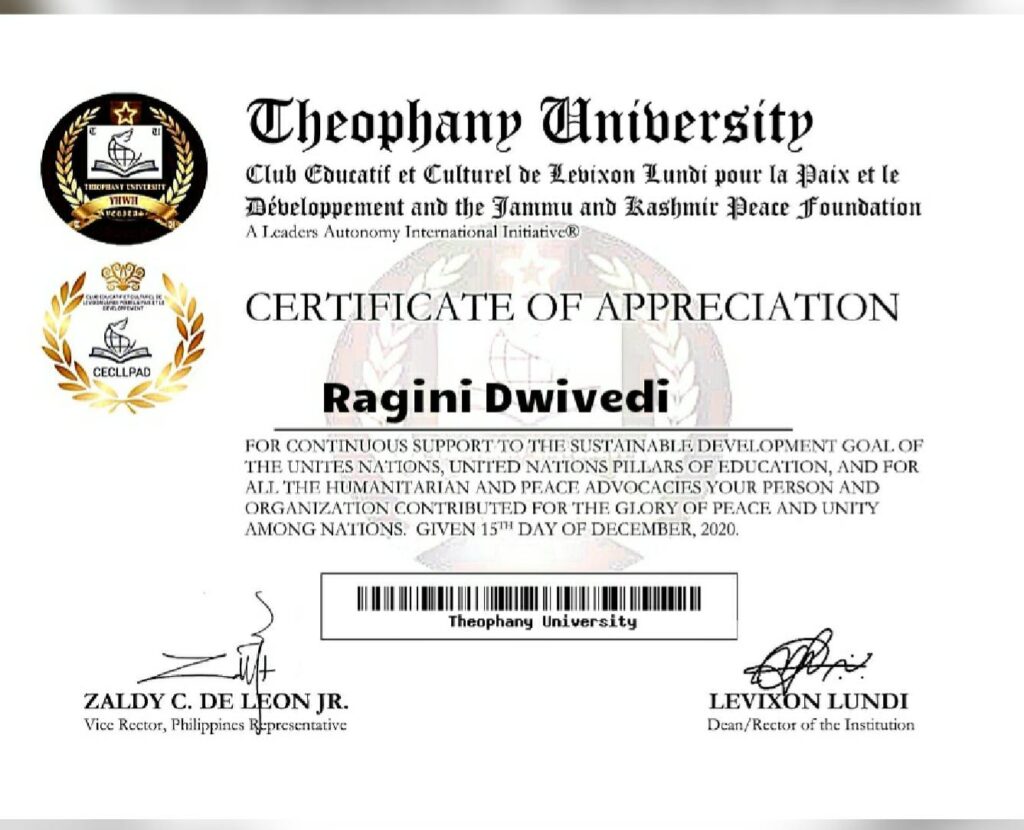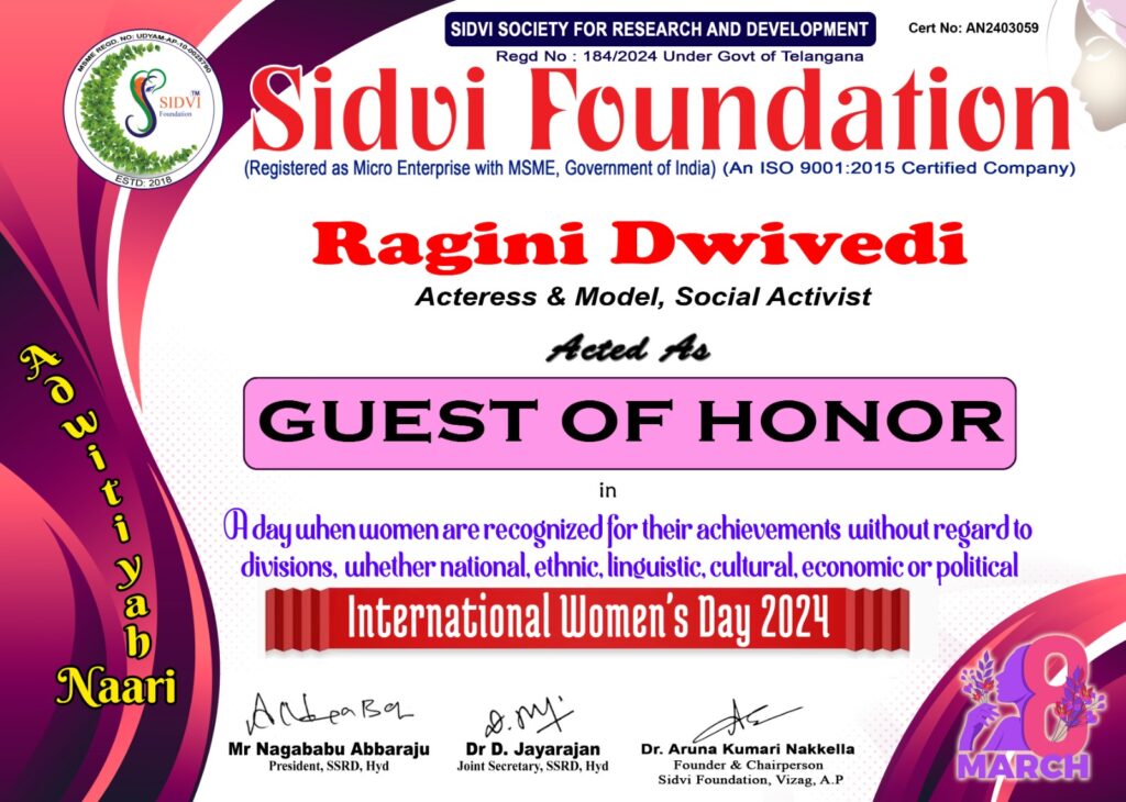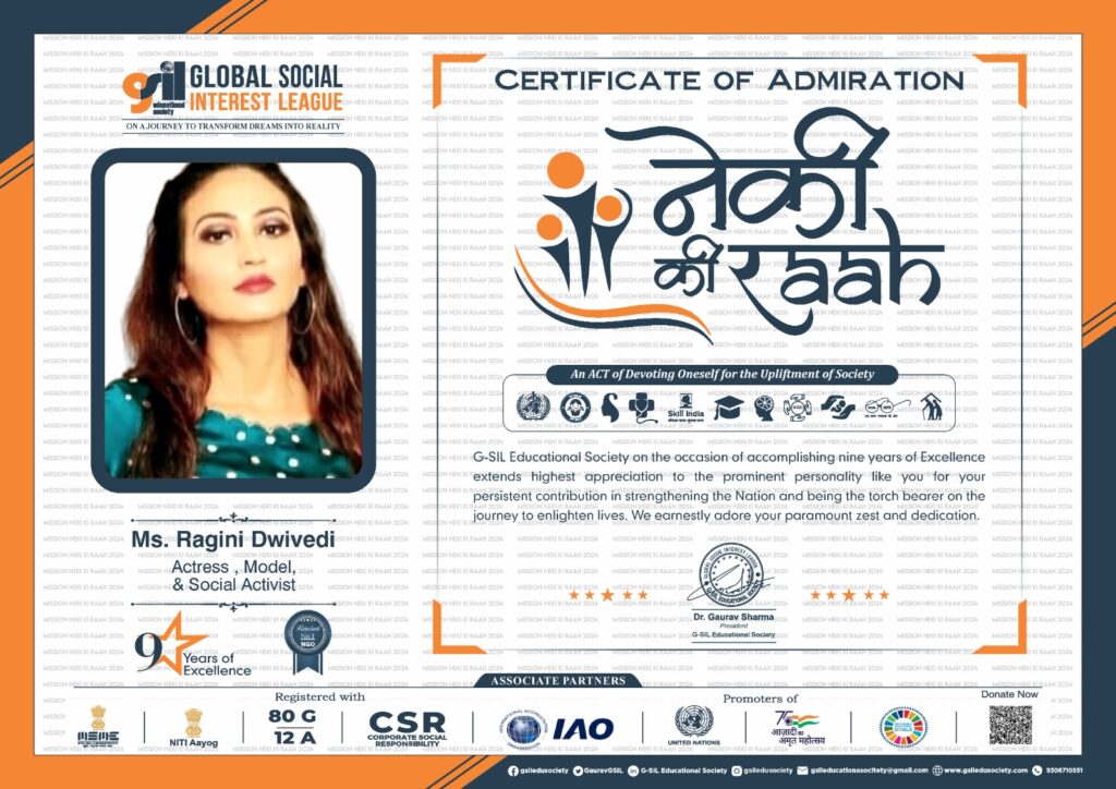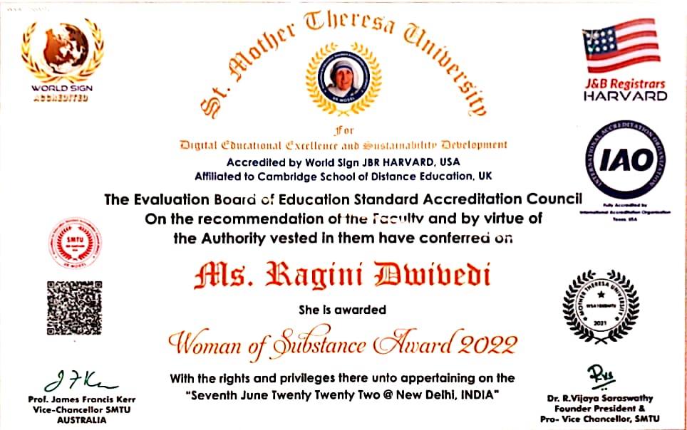 Ragini Dwivedi’s outstanding contributions have garnered significant recognition and accolades. She was listed among the Titanic Indian Beauties of 2020 by the international organization Janparishad India. Her dedication to social work led to her being invited as the Chief Guest in Bhopal in 2021 to felicitate renowned social workers from Ujjain, Dewas, and Ashta. She was honored and featured in the magazine “Women of Substance” by St. Mother Theresa University of Australia for her excellence in Digital Education and Sustainability Development. The award was credited by World Sign JBR Harvard, USA, and affiliated with Cambridge School of Distance Education, UK.Â